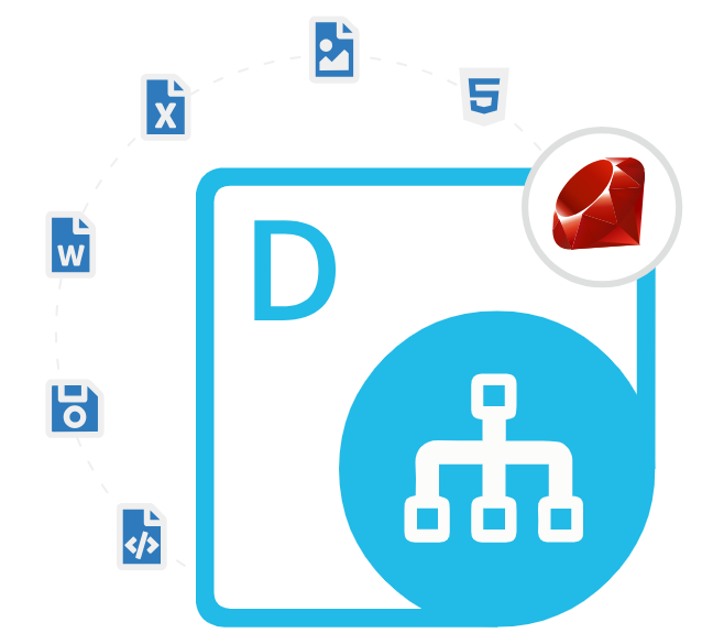 Een Dominant Ruby Diagraming-bibliotheek maakt het mogelijk om Visio-diagramgeneratie, bewerkings- en conversiemogelijkheden te integreren in Ruby-apps. Het maakt het mogelijk om programmatisch te werken met VSD, VSDX, VSS, VSSX, VST en meer.